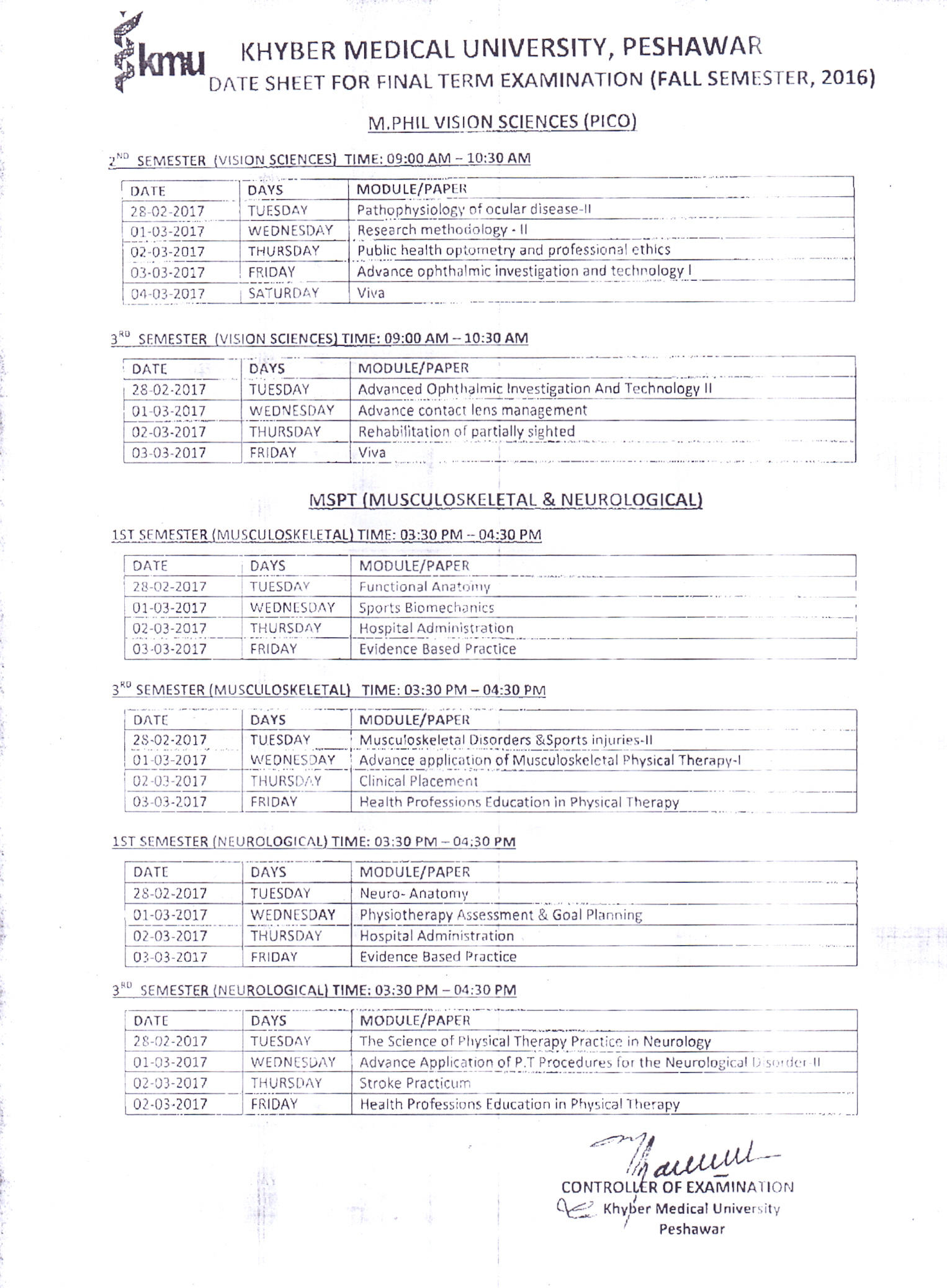 M.Phil Final Exam Date Sheet 2017